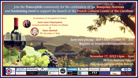 Enjoy French wine, food, and music on November 17 at 6pm on the SKEMA Campus in Raleigh.