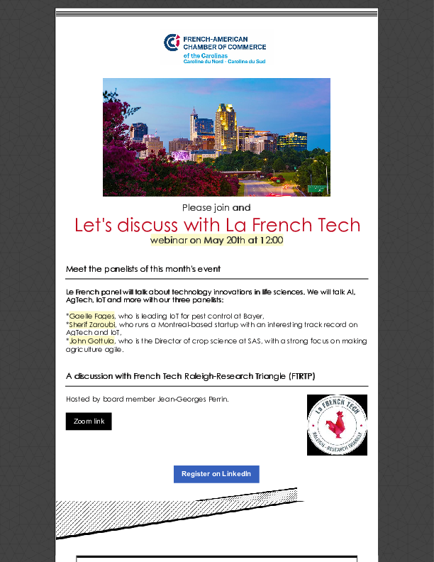This month, Le French Panel will talk about technology innovations in life sciences. We will talk AI, AgTech, IoT, and more with three panelists.