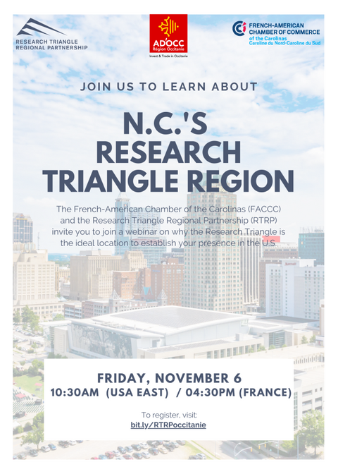 The French-American Chamber of the Carolinas and the Research Triangle Regional partnership invite you to join a webinar on why the Research Triangle is the ideal location to establish your presence in the US.