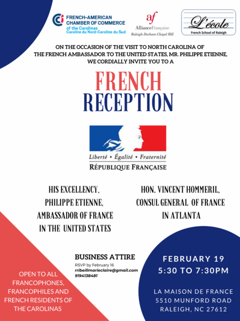 The French Consular Agency in Raleigh, the French American Chamber of Commerce of the Carolinas, L'école- French School of Raleigh and L'Alliance Française de Raleigh Durham Chapel Hill organize a reception at La Maison de France in Raleigh, to welcome