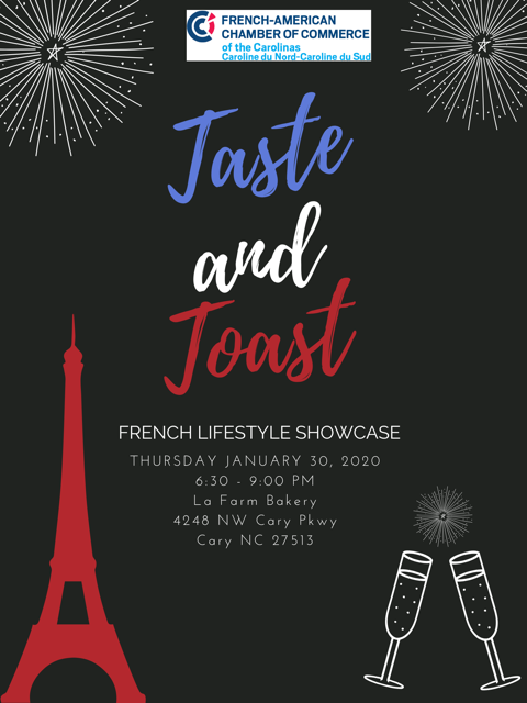 Please join us to celebrate the New Year - Taste and Toast 2020 - and join us for our first French Lifestyle Showcase where you will be introduced to French Food, Wine, Champagne, and French Savoir Vivre by companies here in the Triangle. All are welcome!